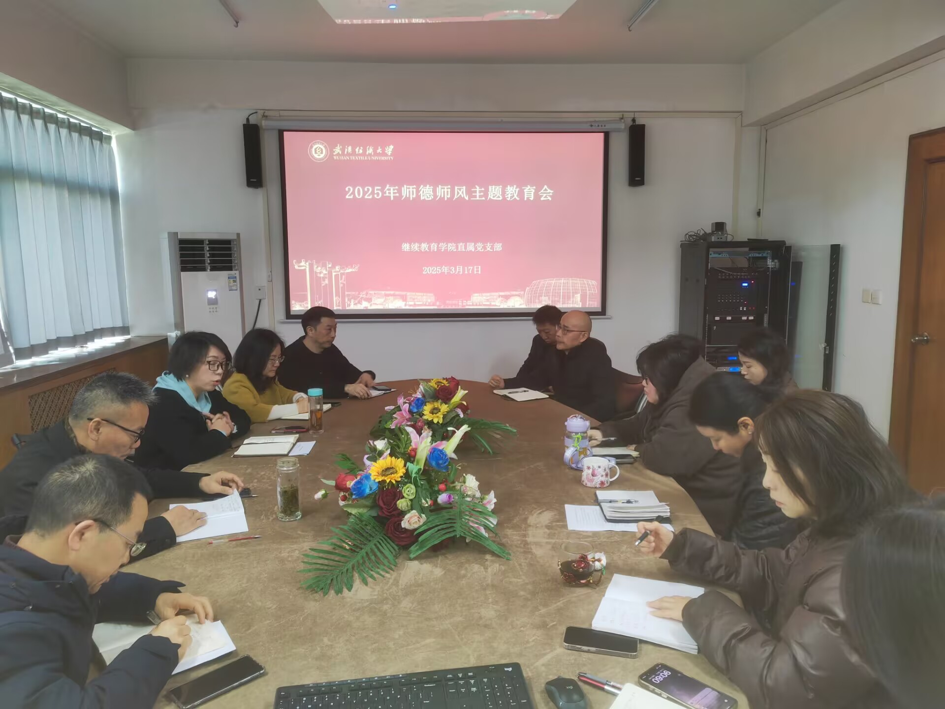 3月17日上午,继续教育学院在行政楼512会议室组织召开中心组理论学习暨师德师风主题教育会,全院教职员工参加了会议。会议由学院直属党支部书记秦梦主持。